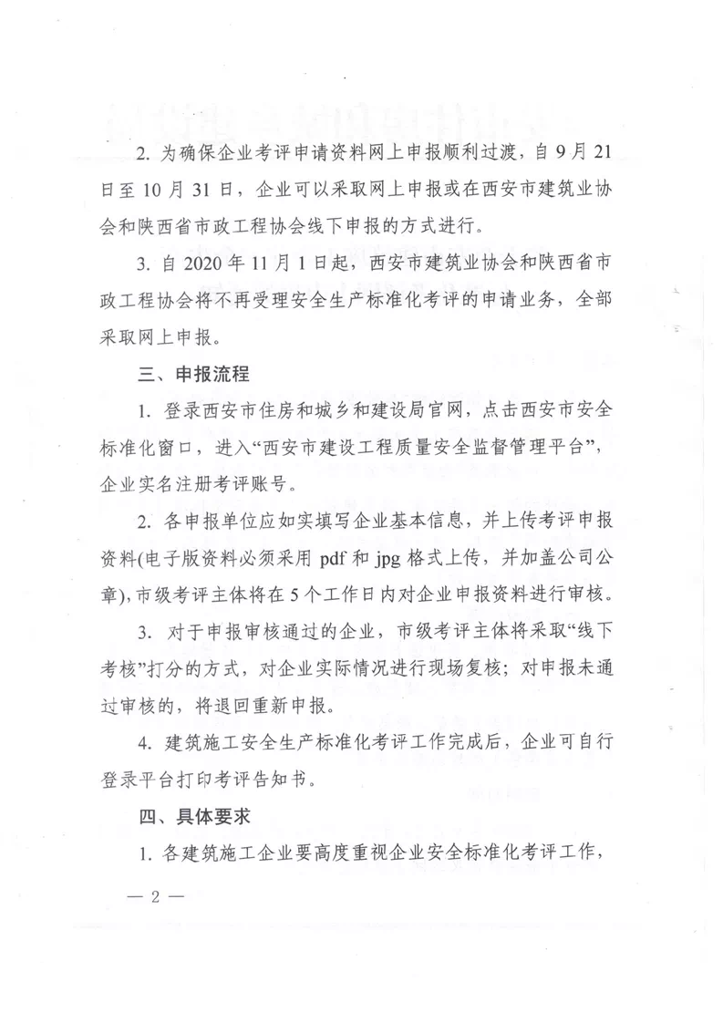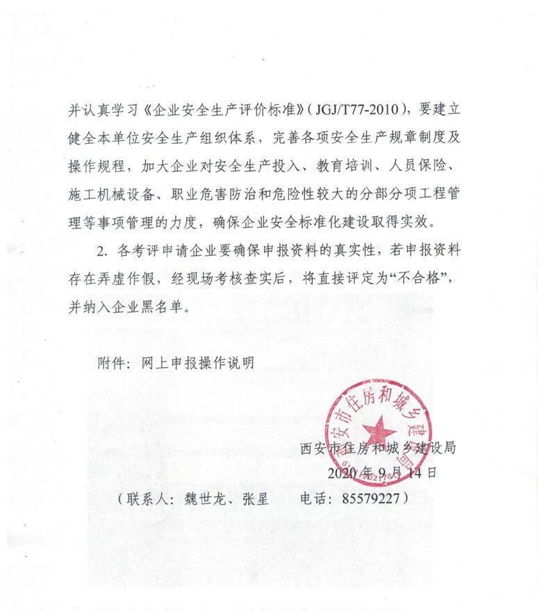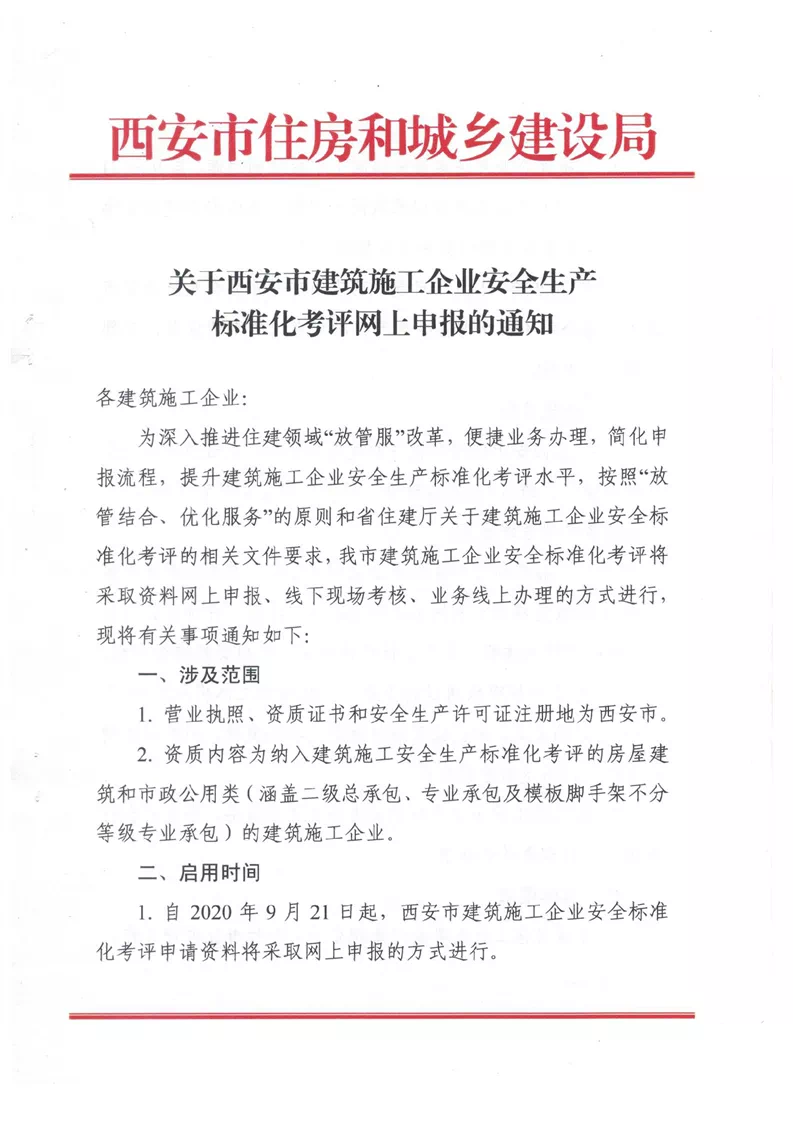 “ 9月15日,西安市住房和城鄉(xiāng)建設(shè)局發(fā)布關(guān)于西安市建筑施工企業(yè)安全生產(chǎn)標(biāo)準(zhǔn)化考評網(wǎng)上申報(bào)的通知。”